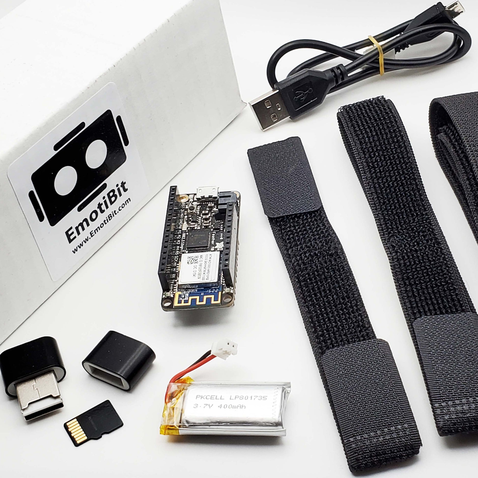 Add-on kit for the Emotibit which includes the Adafruit Feather, battery, and other essential accessories.